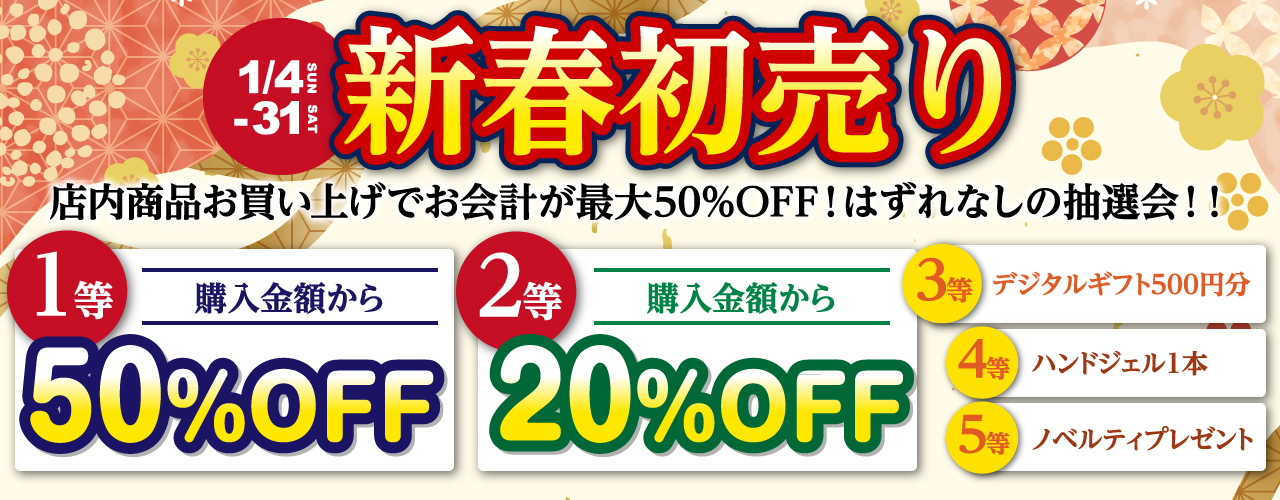 【期間限定!1/4(日)~1/31(土)】期間中、店内商品お買い上げの方【全員対象】の大抽選会も行います。外れなし、最大50%OFFのおトクな大抽選会となっております。